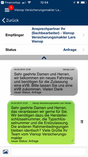 Sie möchten mit Ihrem Finanzberater in Kontakt treten und ihm direkt von Ihrem Smartphone oder Tablet eine Nachricht übermitteln? Finden Sie über Ihre FinanceApp alle relevanten Kontaktdaten Ihres Ansprechpartners schnell und von unterwegs.